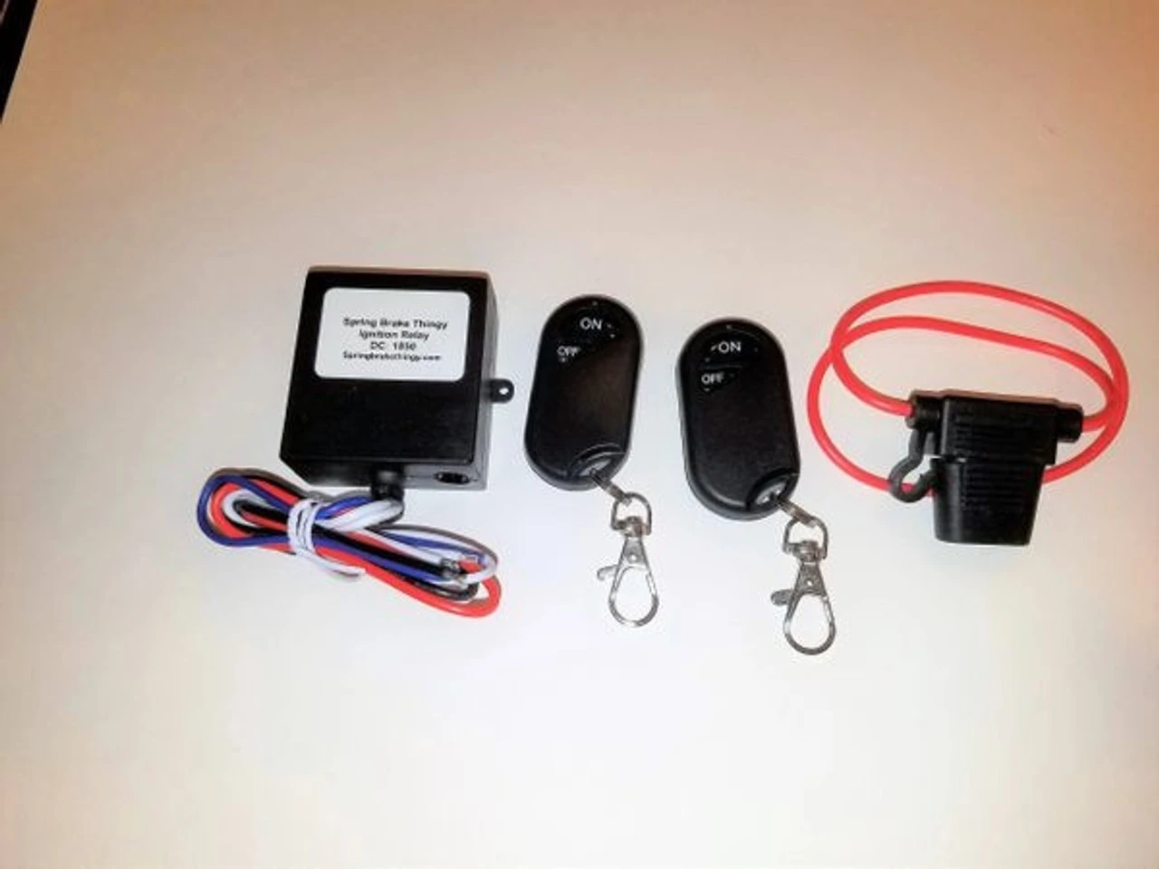 This theft deterrent package comes with a brake that fits your model and a custom water and vibration proof 12 volt relay, 2 key fobs, and an inline 15 amp fuse. Once installed hot wiring is difficult, if not impossible for the average thief. Pushing the “off” button interrupts the ignition circuit to prevent the vehicle from starting. Pushing the “on” button reconnects the ignition circuit allowing it to start. Once installed, the vehicle can’t be started without the key fob. Key fob range ~ 50′