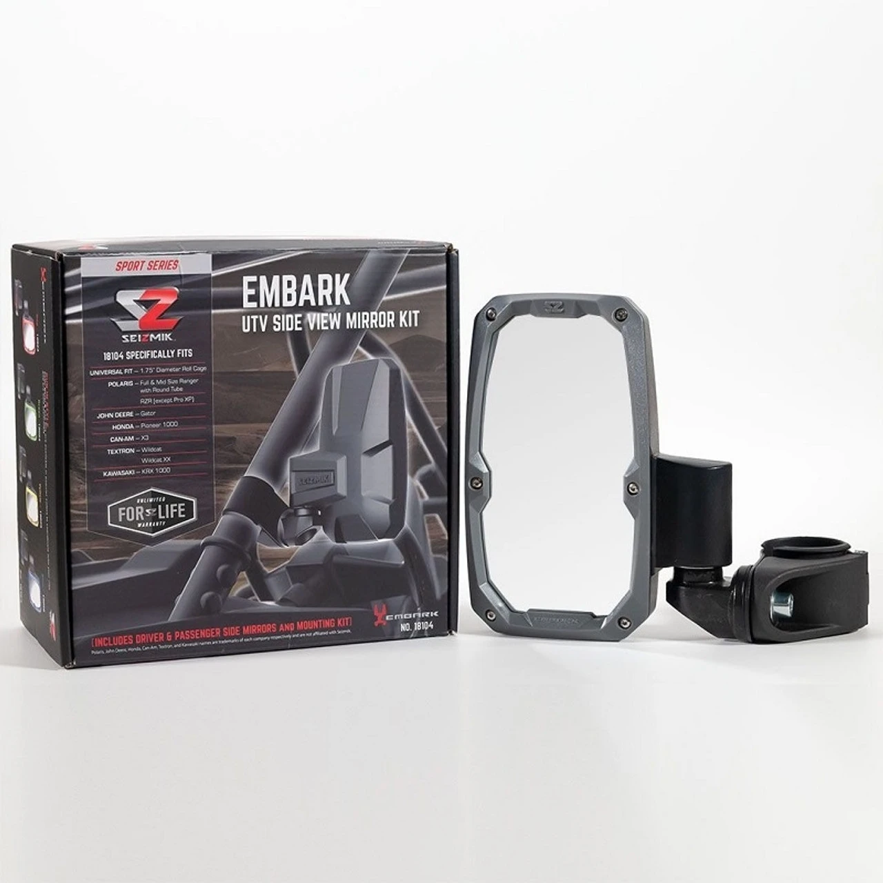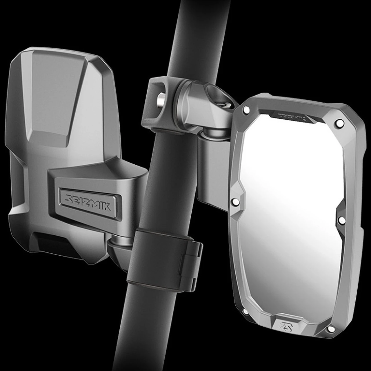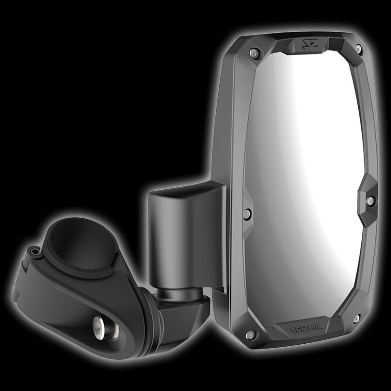Seizmik’s Embark Side View Mirrors are versatile, vertically designed, side mirrors with mounting options available for most any UTV. The aesthetics and vertical design of the mirrors, along with its low profile clamp, allow for a wide range of mounting options. Roll over the hot spots below to discover the features. Mount the mirror in a traditional upright position or mount it inverted to accommodate the field of view your work requires. Equipped with safety features like breakaway geometry, impact resistant ABS housing, a full perimeter bezel mirror guard, and shatter resistant and replaceable safety glass, the Embark mirror will withstand the punishment your UTV faces while out on the trail, in the fields, or wherever your work or play takes you. The Embark Side View Mirrors include replaceable, convex mirror glass.