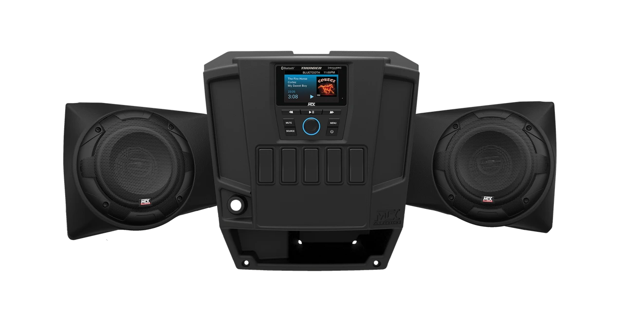 Take in the quiet tranquility of nature and listen to the birds sing their songs and water in the stream… what a second…you aren’t looking for a yoga retreat. You are ready to shake the trees down to their very roots with the Polaris Ranger Two Speaker Audio System by MTX Audio. It includes everything you need to add audio to your stock Ranger so you have tunes pumping no matter where you go (except for that yoga retreat…definitely not going there). The RANGERSYSTEM1 is the ideal solution for adding to your stock Ranger system, to give a serious, much-needed upgrade.
