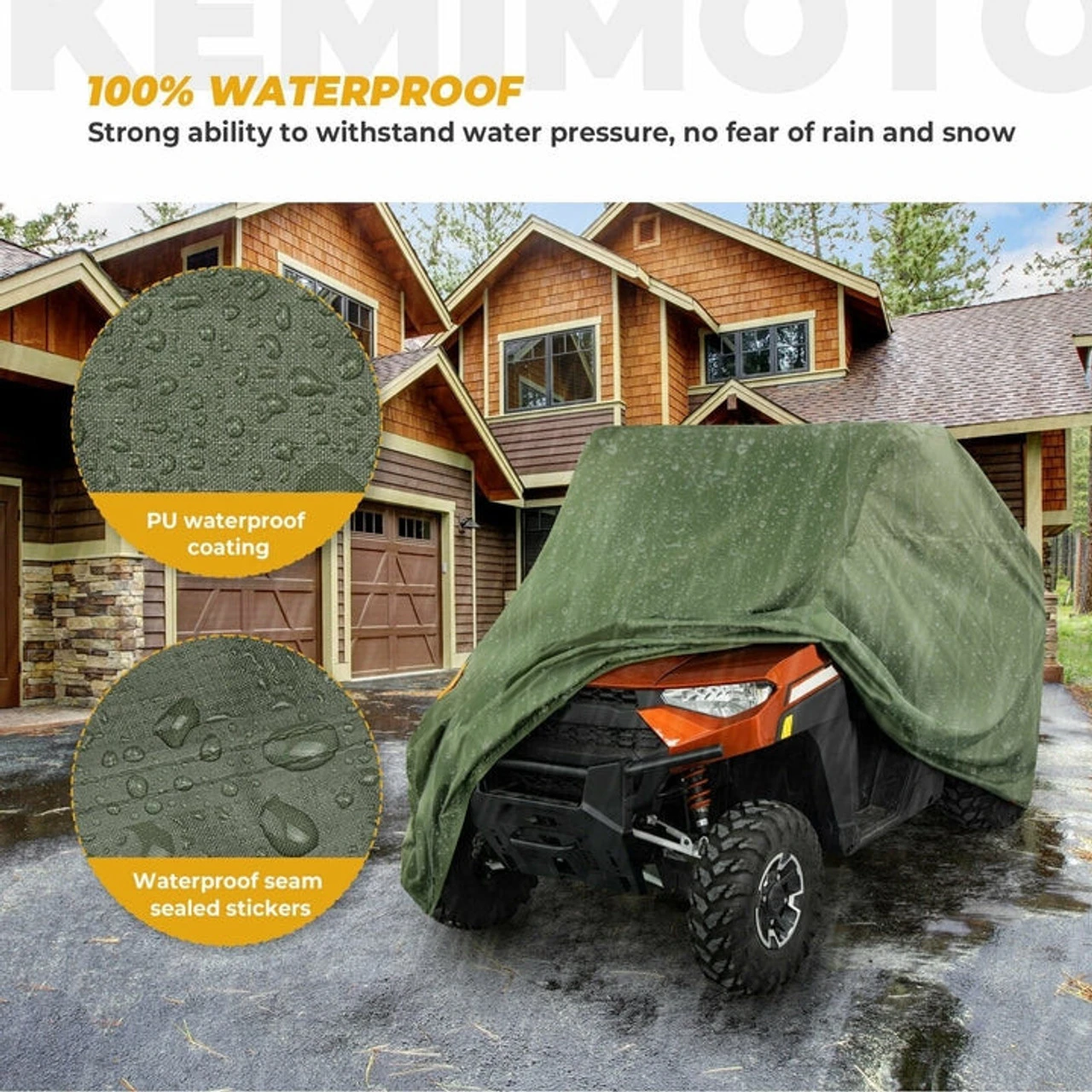 PU coating can withstand water pressure 1000, has strong water resistance, at the same time, has good air permeability and moisture desorption, safe, environmentally friendly and non-toxic. Waterproof strips are attached to the seams, which has good waterproof effect. The seam of the utv cover waterproof heavy duty is not easy to seep water, keeping your UTV dry.