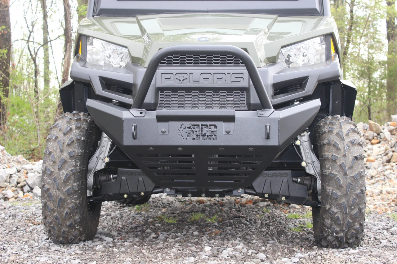 Whether you are moving across a forest or hitting deep ditches from the front, it’ll damage your UTVs. Be it a hunting venture or a camping tour or a friendly race in desert terrains, easily mount Midsize Front Bumper onto the Polaris Ranger’s front. Not only will it give it a sturdier look but also it will take the hit for you. Continue to swift past the wobbly pathways at a high speed without worrying about damaging your car’s front with such robust protective gear. The tough bumper and brush guard are manufactured with heavy stainless steel to make it as sturdy as a rock! The front bumper will replace the front brush guard. It arrives with an optimal bolt-on stinger bar and is compatible with removable winch plate. The durable bumper is made with American steel in Batesville Arkansas. It offers superior protection via powder coated black. The laser cut finish makes it a great fit for your UTV’s overall look.