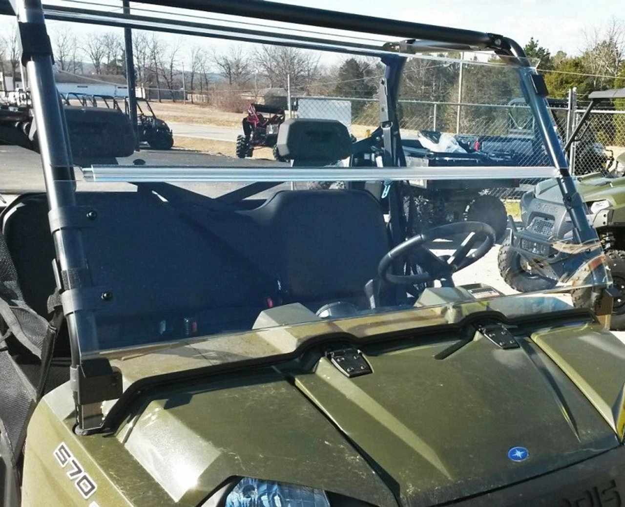 Get versatility and functionality in your Polaris Ranger 570/700/800 by swapping your one-dimensional stock windshield with this aftermarket UTV / side by side Folding Windshield by Bad Dawg. This flip windshield for the Polaris Ranger is built from ¼” of thick polycarbonate that is hundreds of times stronger than glass. This bottom of this polycarbonate windshield features a gasket that protects the body of your machine and does not prevent access to your Polaris Ranger’s hood compartment. Installing this UTV folding windshield onto your Polaris Ranger is super easy with all the necessary hardware you need included. Order this folding polycarbonate windshield for your Polaris Ranger today!