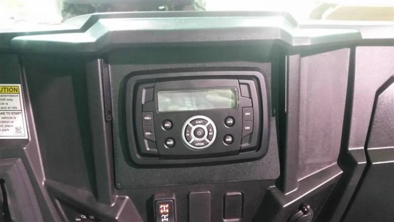 Now, you can mount a stereo in the dash of Mid-Size/2-Seat Ranger. This kit includes the stereo, mounting plate, and plastic factory style fasteners. It is everything your need to mount the stereo in the dash but no additional wiring is included. In other words, you have to wire it up to your speakers of choice as well as your powder source that is located under the hood panel. The panel requires drilling (4) 5/16″ diameter holes for the plastic factory style rivets.