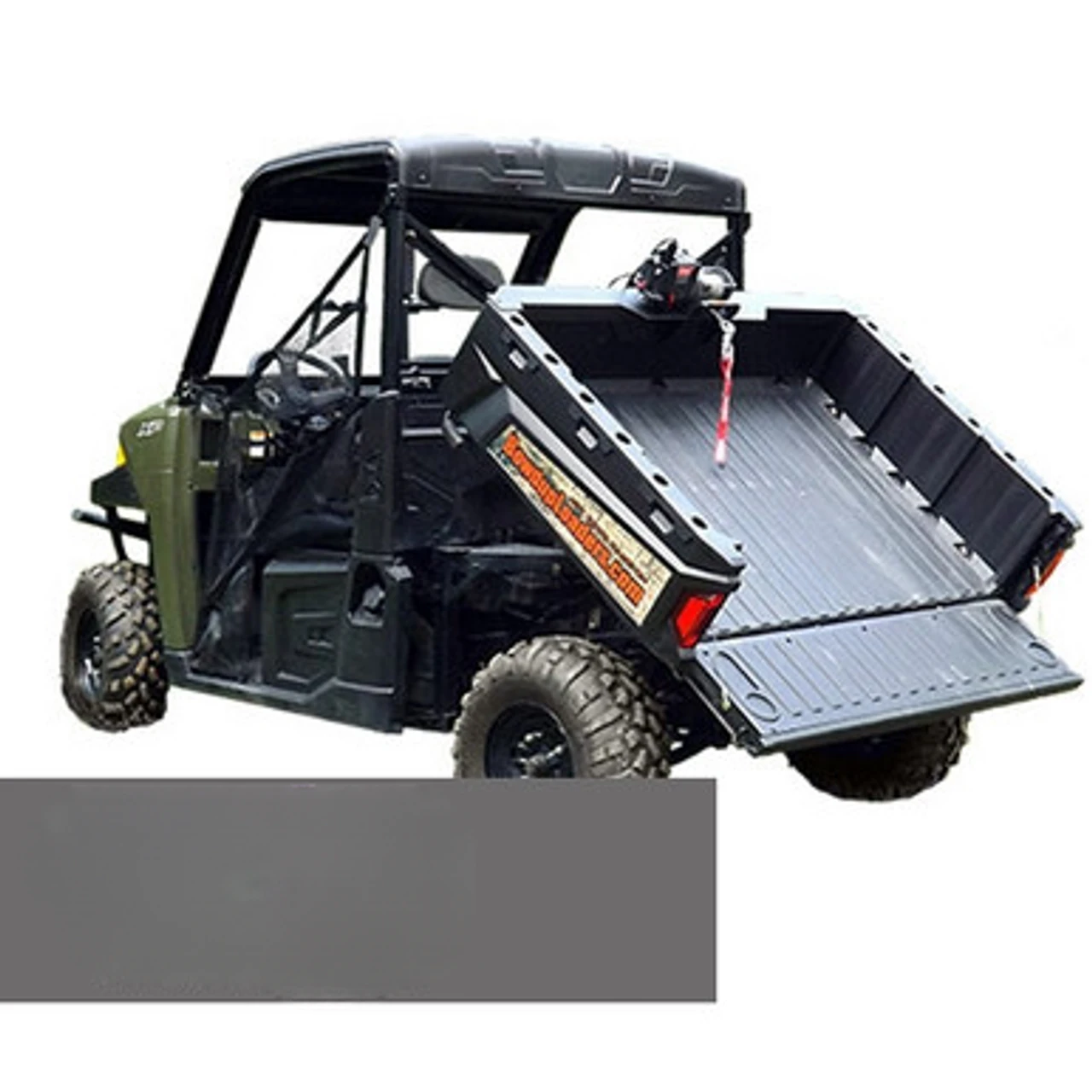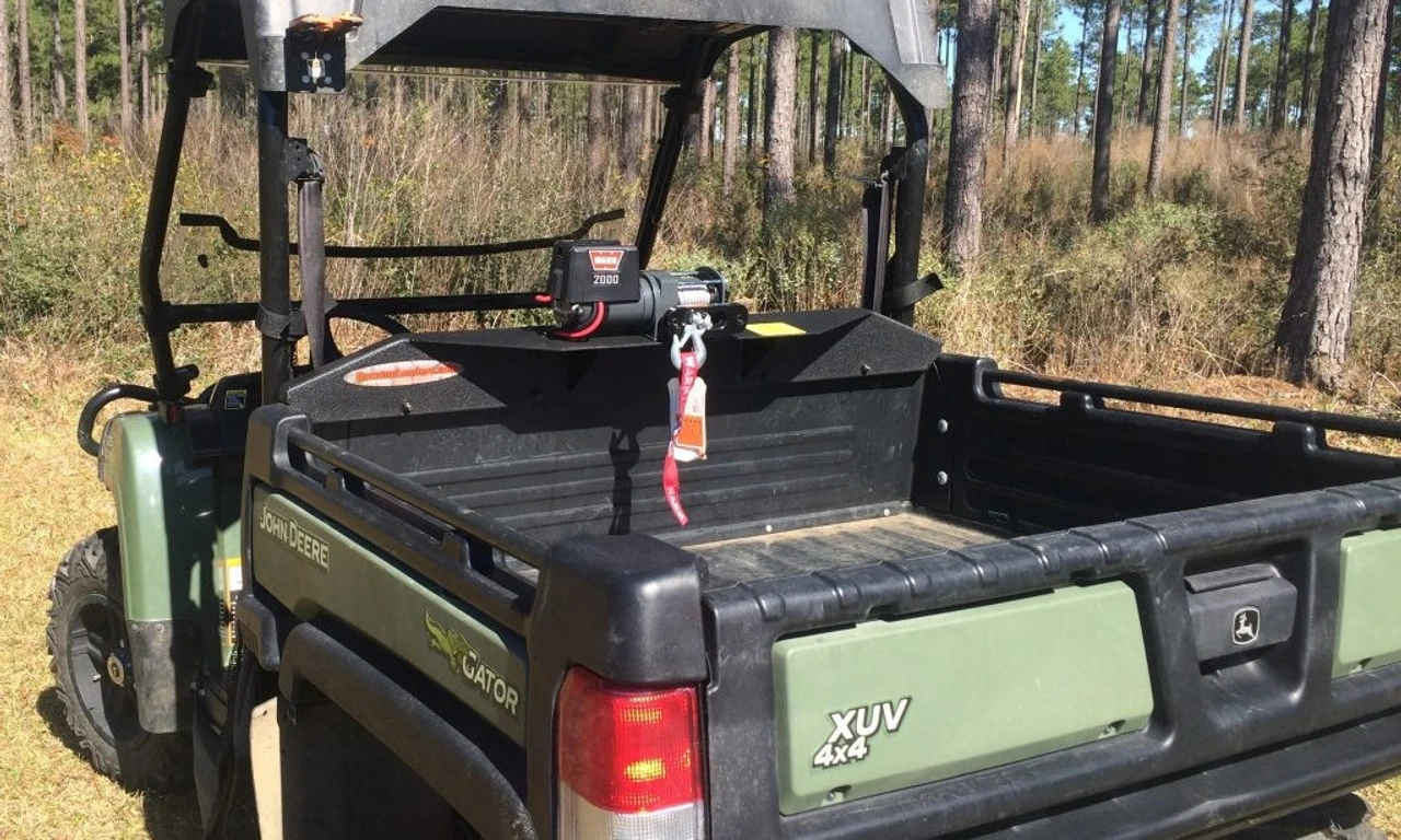 The “W” series loader utilizes a wiring harness (included) to attach to the UTVs battery system. Basic electrical skills are required. Mount the controllers, route the harness and secure in place as defined in the photo instructions, install the restraint cable parallel to the beds pneumatic cylinder, tilt the bed up and lock on the loader assembly in place. Connect to the UTVs battery system and you are ready to operate.