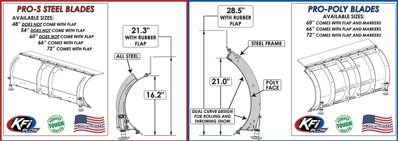 - The 66″ & 72″ blades include a 7″ high 2-ply top rubber flap