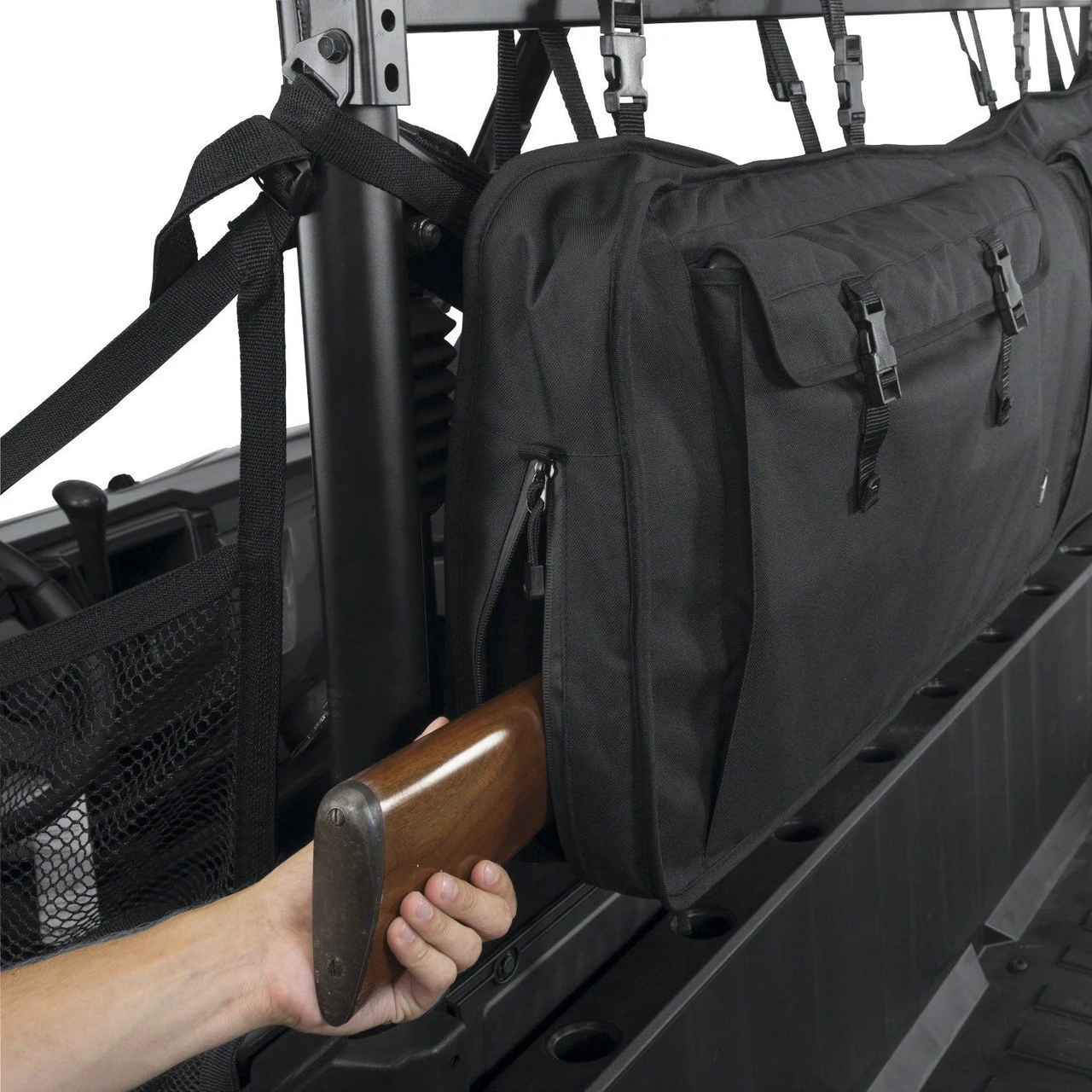 The Polaris Ranger Gun Carrier attaches securely to the back of the Polaris Ranger roll cage with heavy-duty straps and quick release buckles. The extra thick padding keeps your rifles securely protected for vehicle jarring. If you’re looking for a secure and safe way to travel with your guns, then this Polaris Ranger Gun Carrier (2 Guns) is just the ticket!
