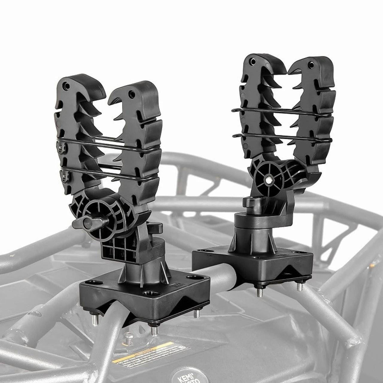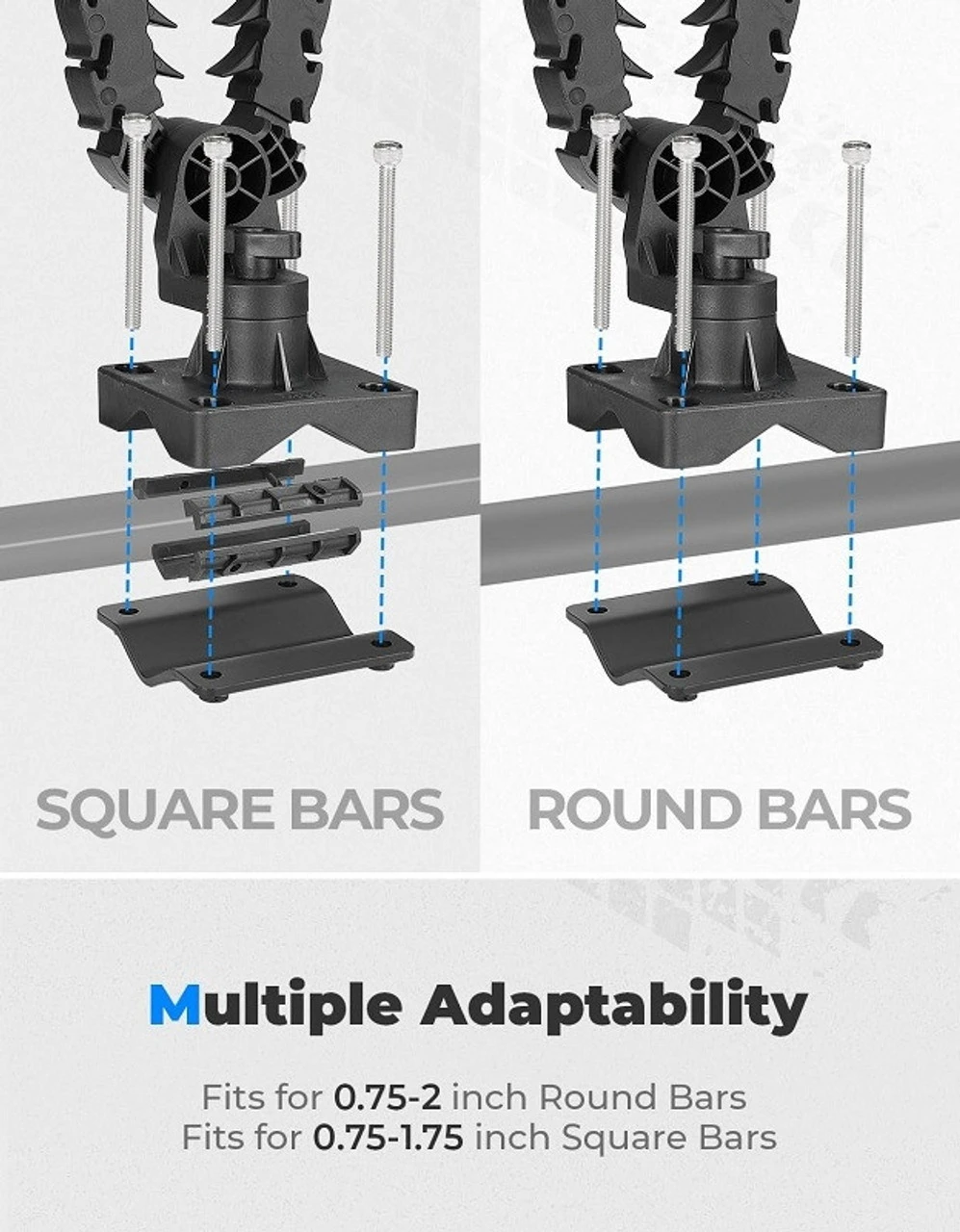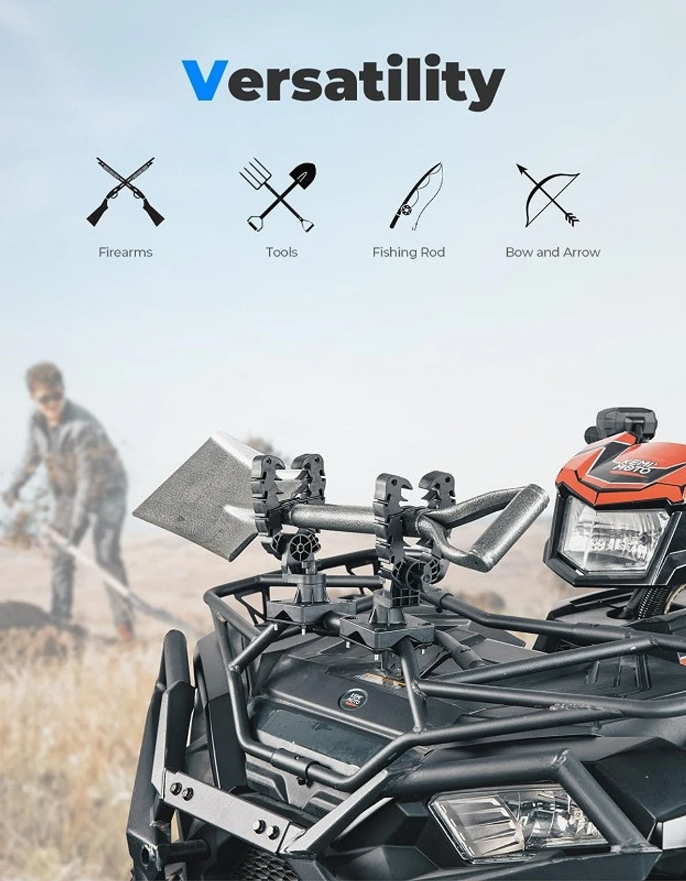 The U-grip can be adjusted to120-degree. The base rotates 360 degrees. Easy to hold your gear such as rifles, shotguns, bows, fishing poles, shovels, ice augers, and other farm equipment.