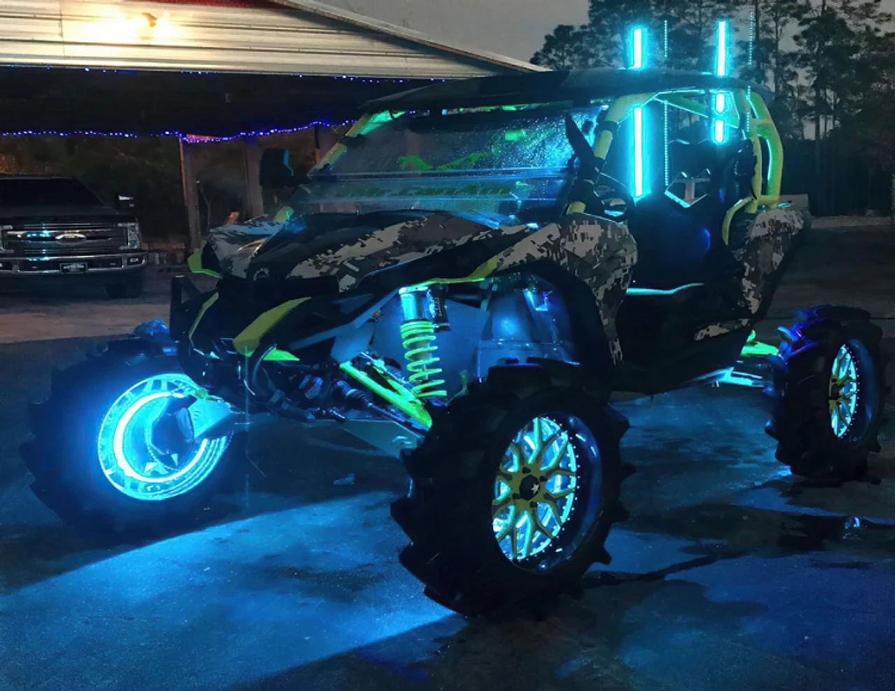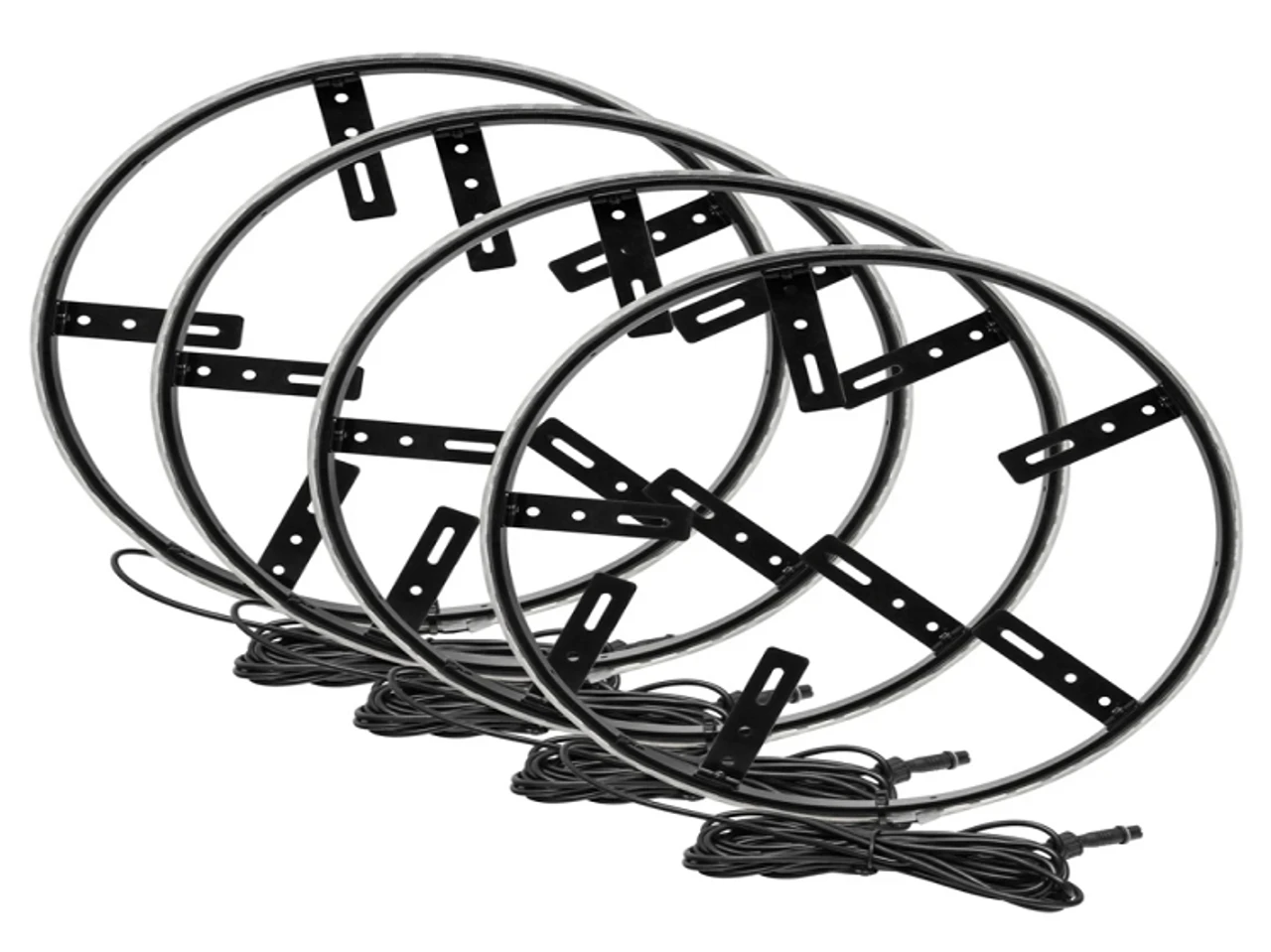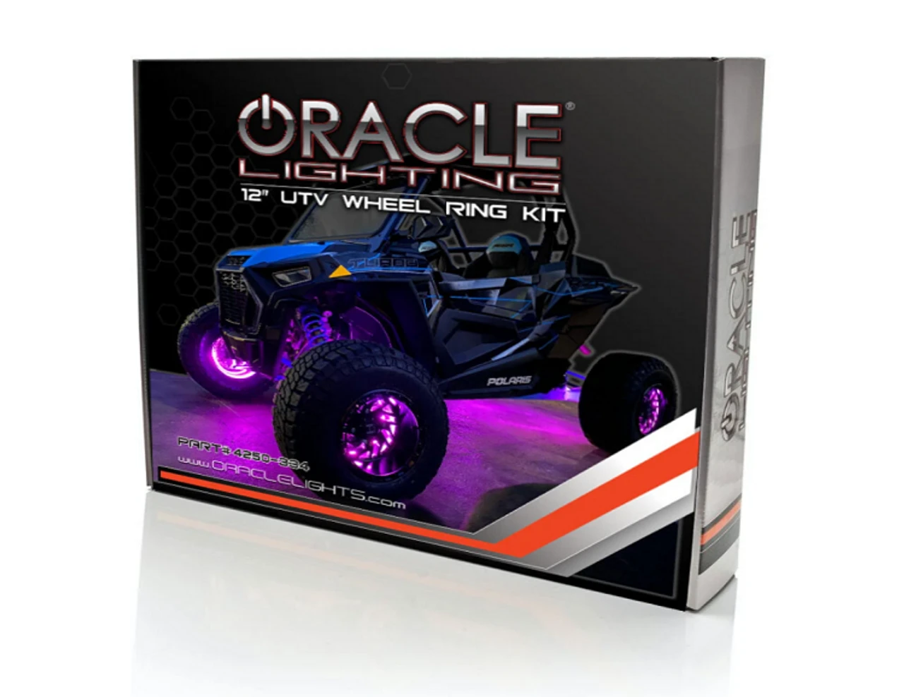 ORACLE Lighting illuminated LED wheel rings are an easy and effective way to light up the wheels, underbody, and suspension on your UTV. This head-turning lighting product consists of a set of (4) LED illuminated aluminum rings which install around the brake rotor and attaches to the fixed knuckle assembly. The effect is a large ring of light which accents custom wheels and makes your rig stand out. The 12″ diameter is designed to fit most wheels 14″ and larger and works on most UTV, ATV, and sub-compact car applications.