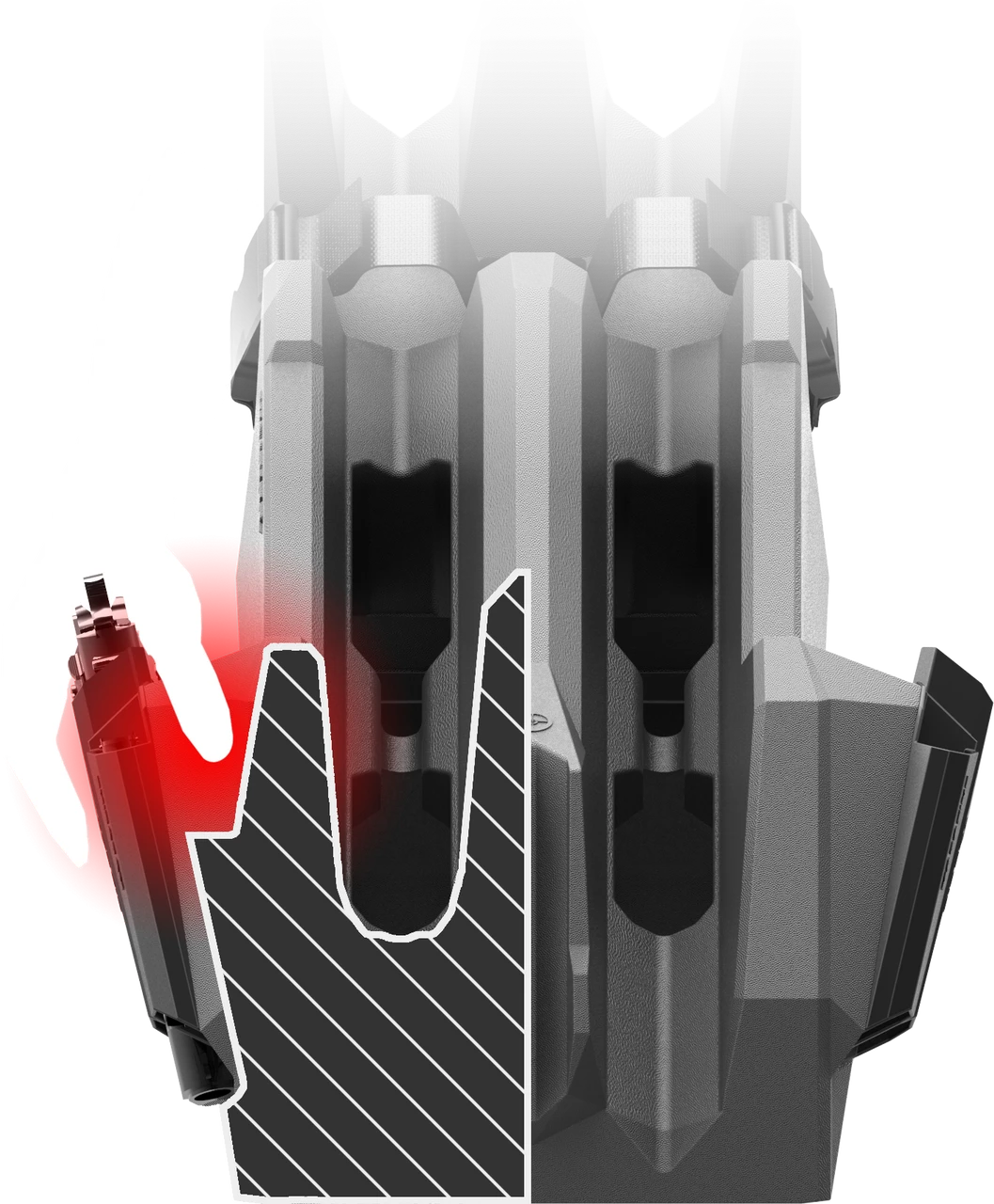- ERGONOMICALLY DESIGNED EASY ACCESS —Ergonomically designed finger pockets allow you to securely grasp pistol as you remove it from the holster in one quick motion. Regardless of which holster or hand is used or whether you’re reaching over the ICOS 2 for the far pistol or drawing from the holster next to your hip, a secure grip is ensured.