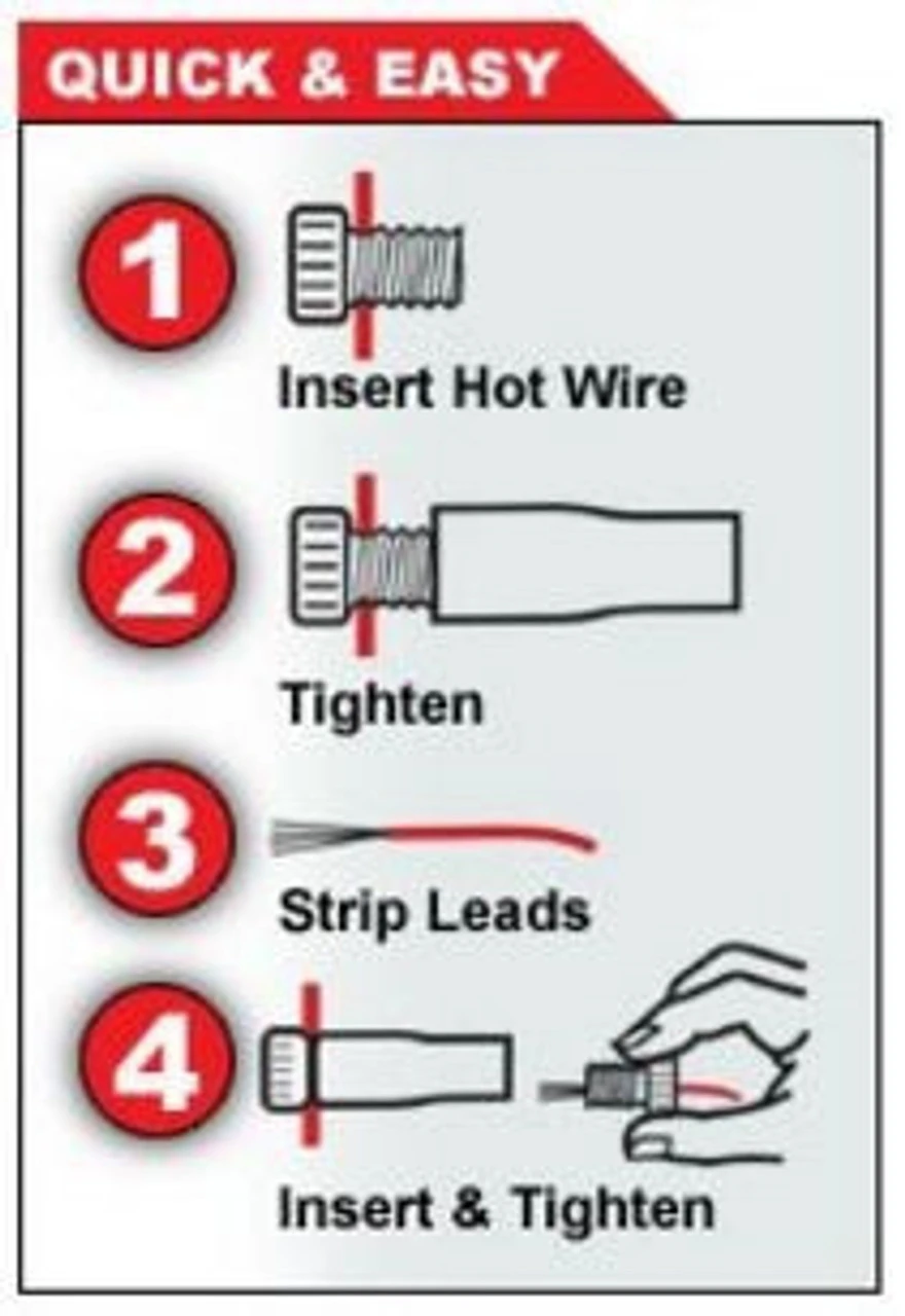 Posi-Tapâ„¢ Connectors allow you to tap into hot leads without cutting or stripping them. Just insert wire to be tapped into the grey cap and hand tighten into the barrel. The conductor point pierces the tapped stranded wire without compromising its conductive integrity. Then, you insert one or more stripped wires through the red cap, and hand tighten for a multiple hookup using only one connector.