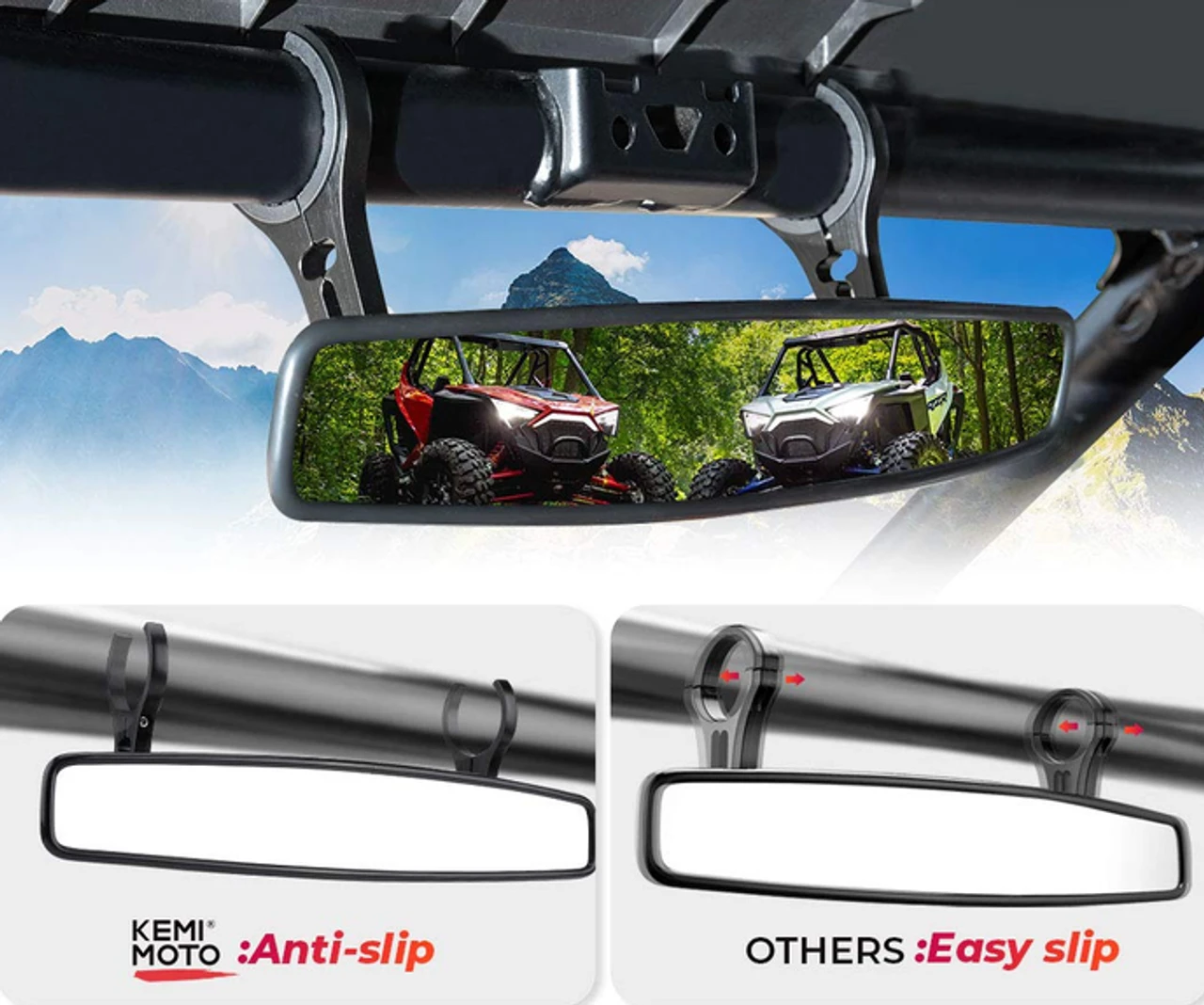 - 15″ length convex UTV rearview mirror, provides a super wide field of vision for you to easily prevent blind spots and some traffic accidents, which can improve your safety greatly. The design of the UTV rearview mirror back adds stress points to the mirror, making it stronger.