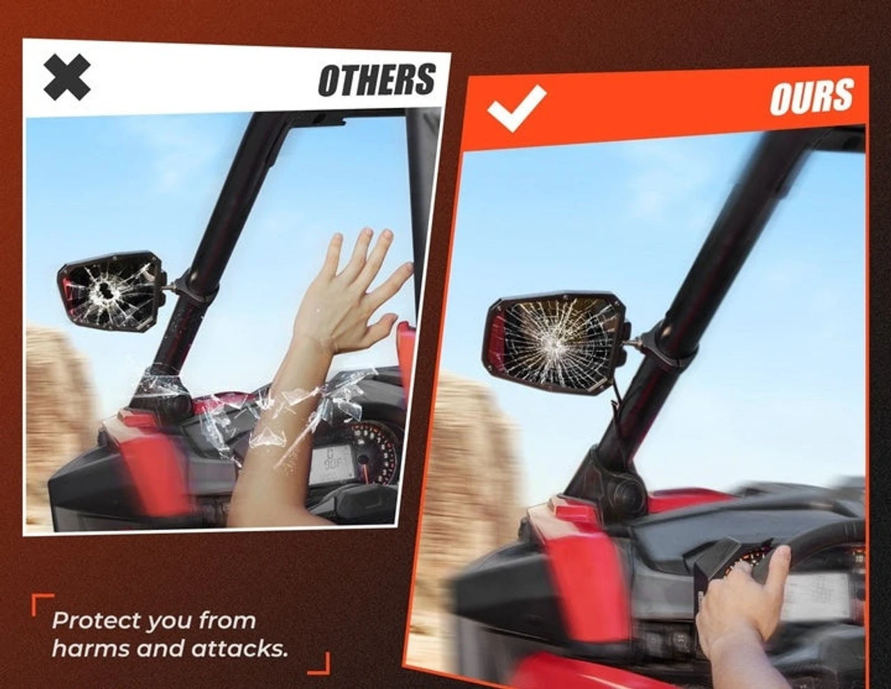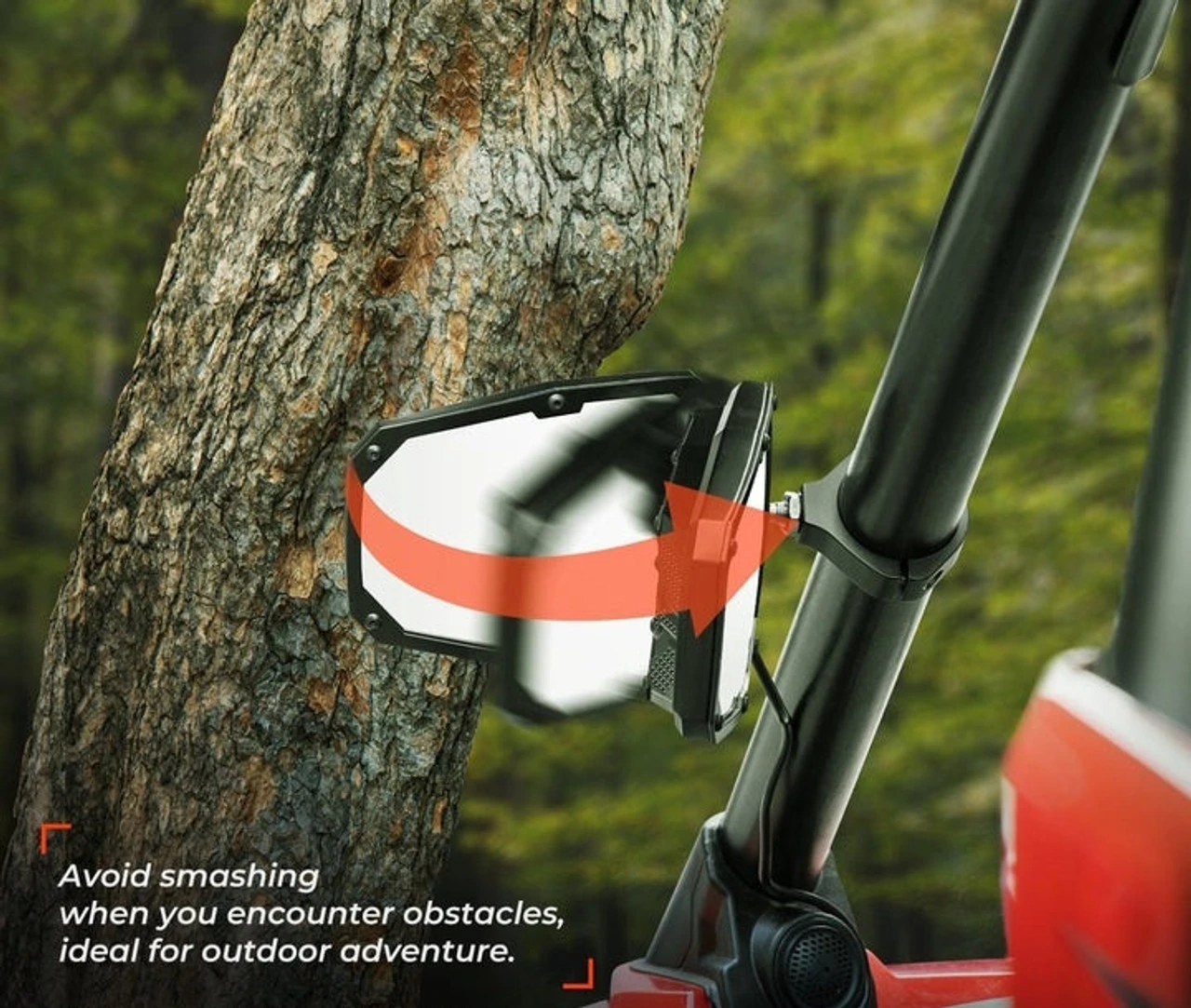 These UTV side view mirrors will fold up when hitting a tree or an obstacle, which not only reduces the damage but also increases the service life of the aluminum alloy mirror. UTV mirrors with ball pivot mount have 360-degree easy adjustment.