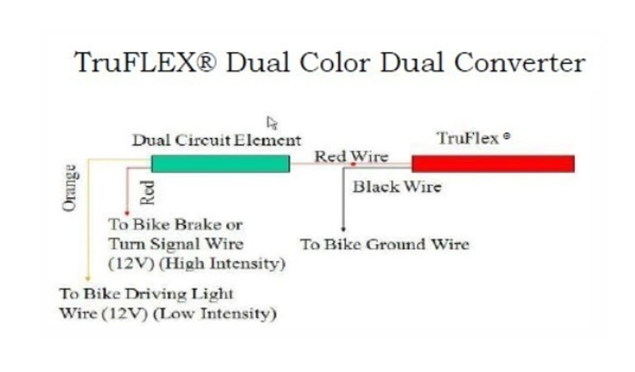 TruFLEX® Dual Color Dual Converters install in line with the single red power from the Custom Dynamics® Dual Color TruFLEX® LED light strips to convert it from single intensity (i.e. Brake Only) to dual intensity (i.e. Run/Brake) while the Amber LEDs provide turn signal function. Can also be used with Custom Dynamics® Dual Color 2 Section TruFLEX® LED light strips.