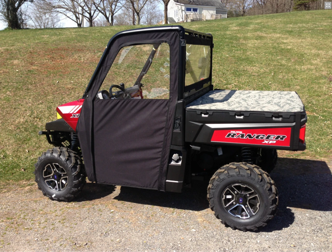 Polaris Ranger XP side enclosures feature 600 denier Polyester shell with automotive grade clear flexible acrylic side windshield sewn in upper section of doors .
